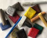 Die Materialien zerkleinere und mahle ich per Hand mit einem Mörser. Um die Farbpalette zu erweitern, verwende ich Pigmente, wie zum Beispiel Brentonicoerde* und